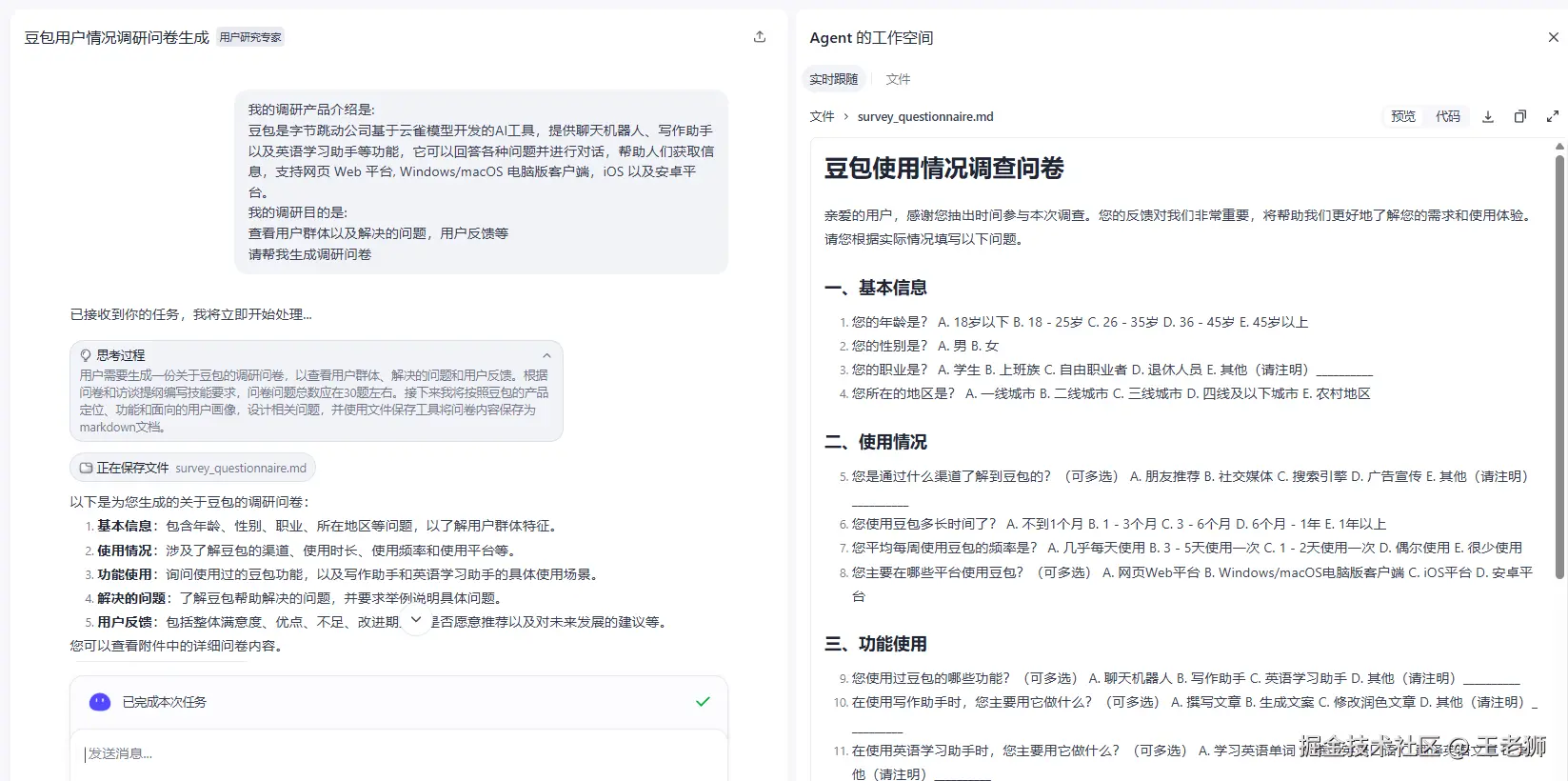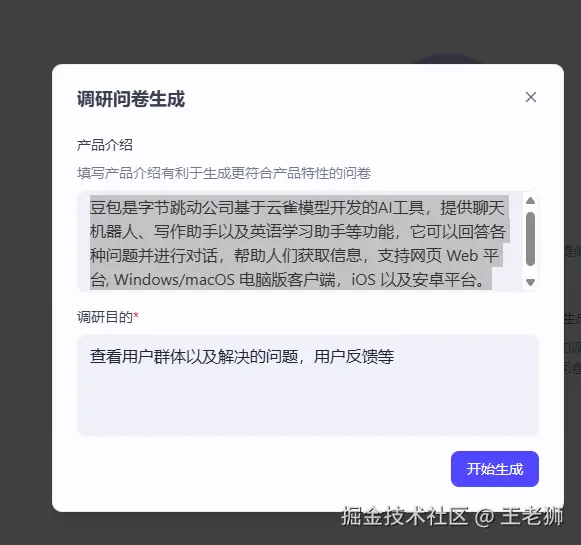 用户研究专家提供了以上4种能力。以调研问卷生成功能为例: