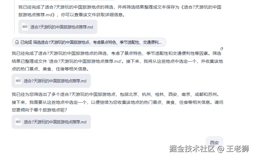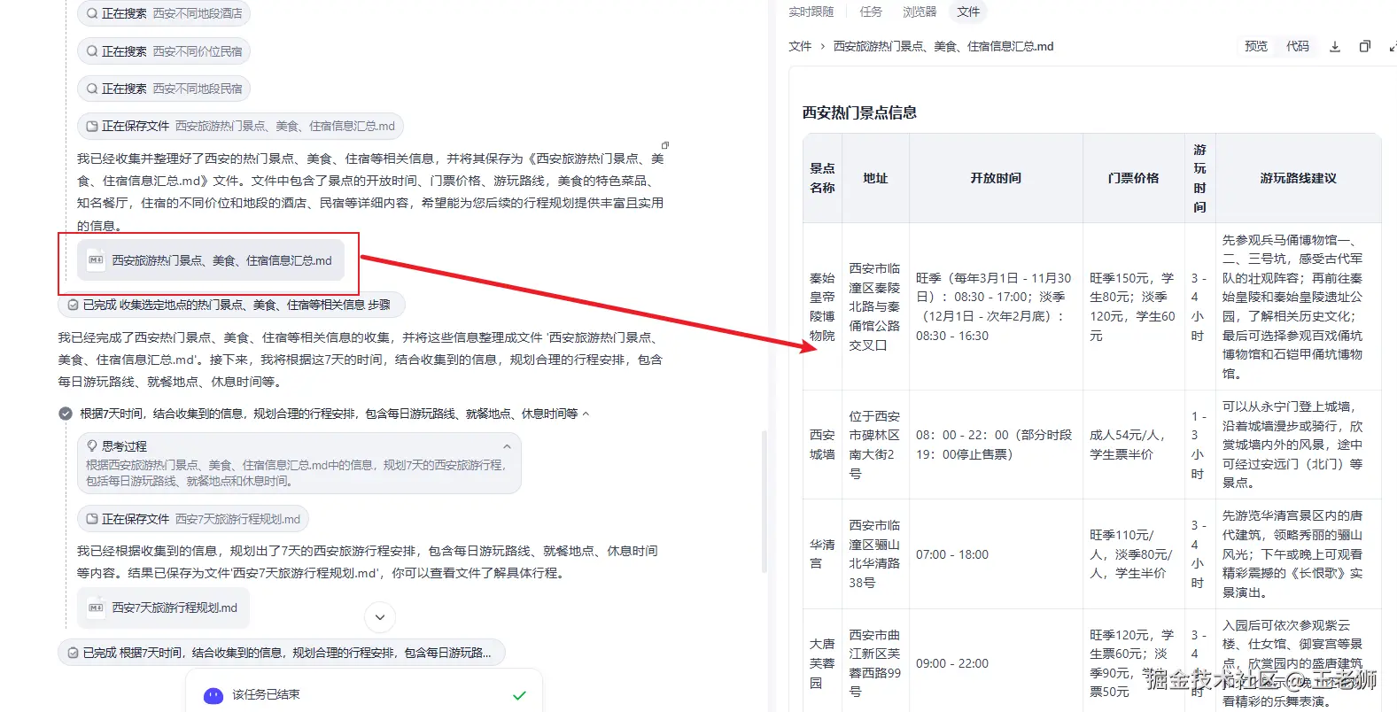 中间过程有些需要用户确认的需要在此交互,比如AI选出推荐的旅游地点之后,用户需要输入对应的地点,然后继续执行后续逻辑。整体来看,规划模式输出的内容更加详细。但运行时间也更长,预计10分钟左右。