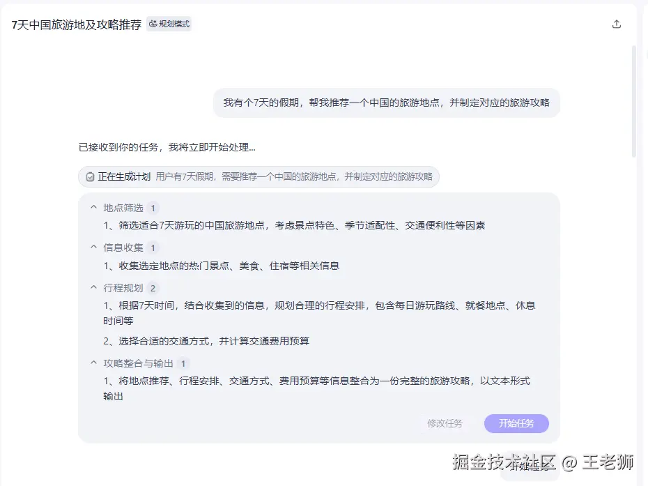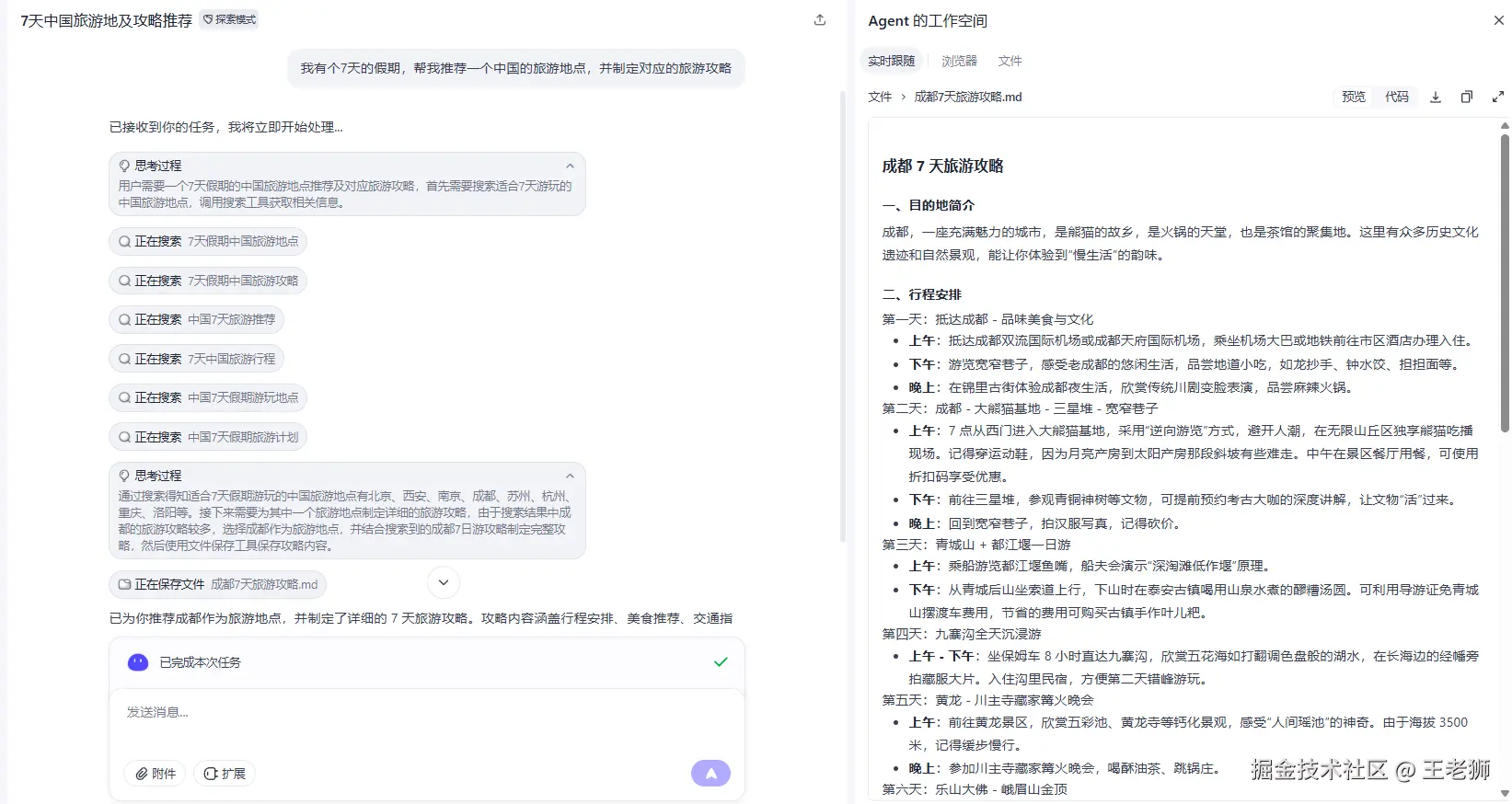 接下来,以"我有个7天的假期,帮我推荐一个中国的旅游地点,并制定对应的旅游攻略"为任务,看下两者执行的差异。