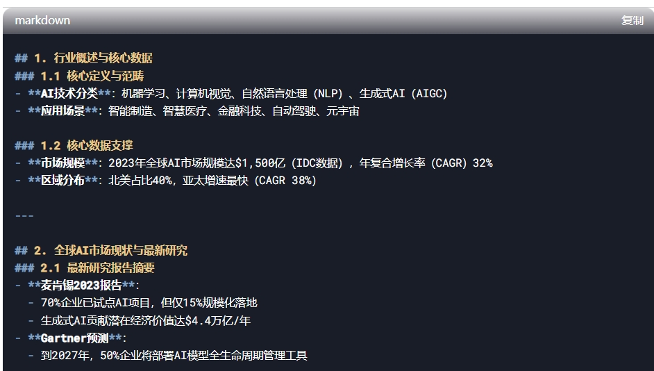 请给我生成一份AI行业发展趋势报告的PPT,内容包括内容大纲目录,行业最新研究报告,分析产业链,上下游关系,做出分析和建议,报告需要有数据支撑,具有实用价值,考虑呈现方式,保证格式正确,用markdown格式输出
