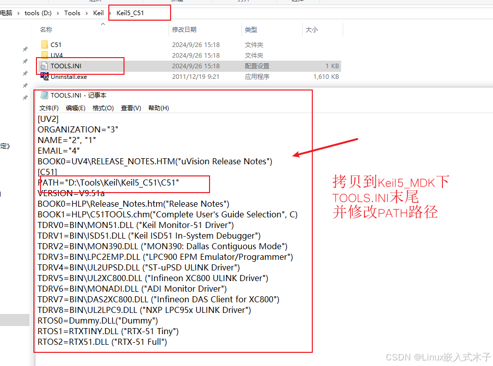 ⑤将Keil5_C51下的TOOLS.INI文件拷贝到Keil5_MDK目录下TOOLS.INI文件的末尾,并修改执行路径。如下图