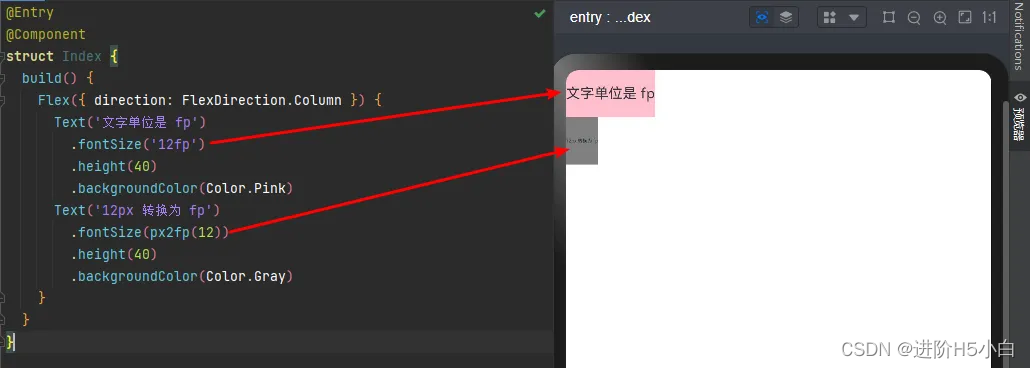 | fp | 字体像素,与 vp 类似适用屏幕密度变化,随系统字体大小设置变化。 |