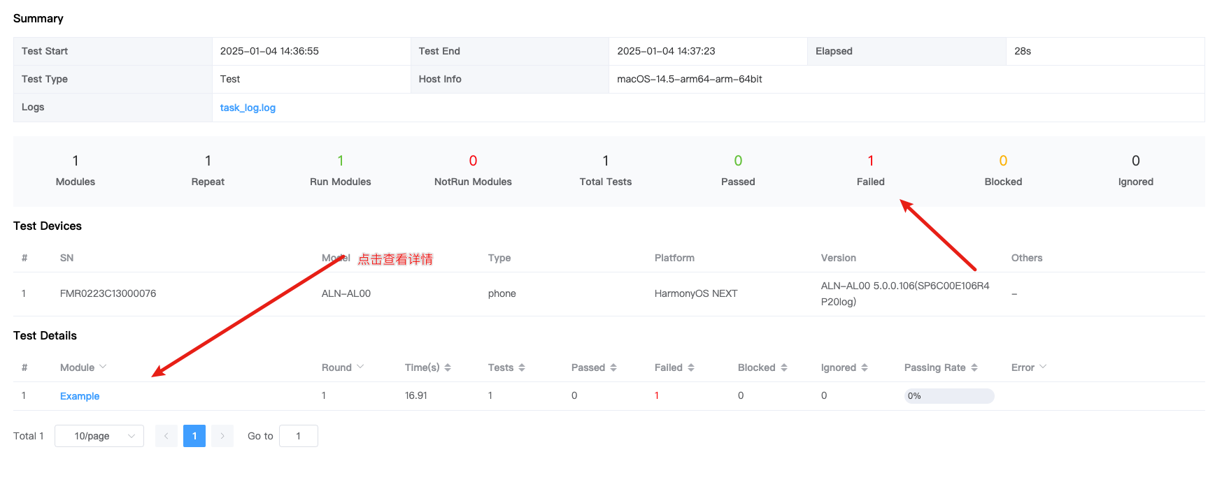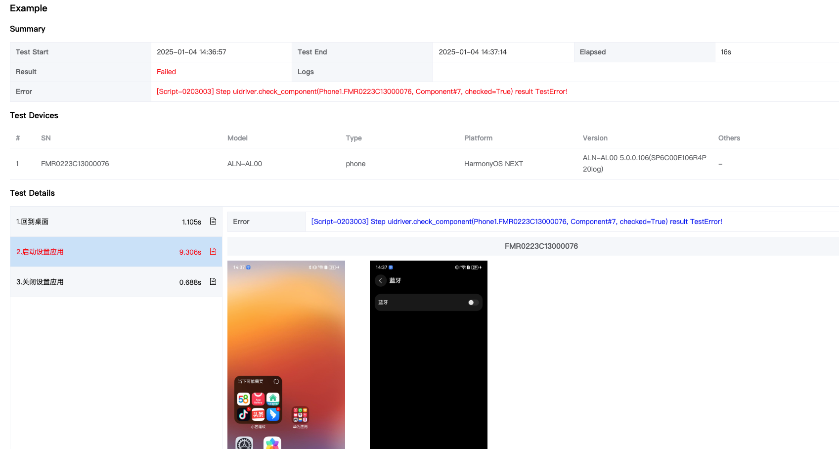 - Hypium能够为执行的用例生成详细的用例执行报告,并且自动记录设备日志以及执行步骤截图,为开发者和测试人员提供高效和专业的测试用例执行和结果分析体验。